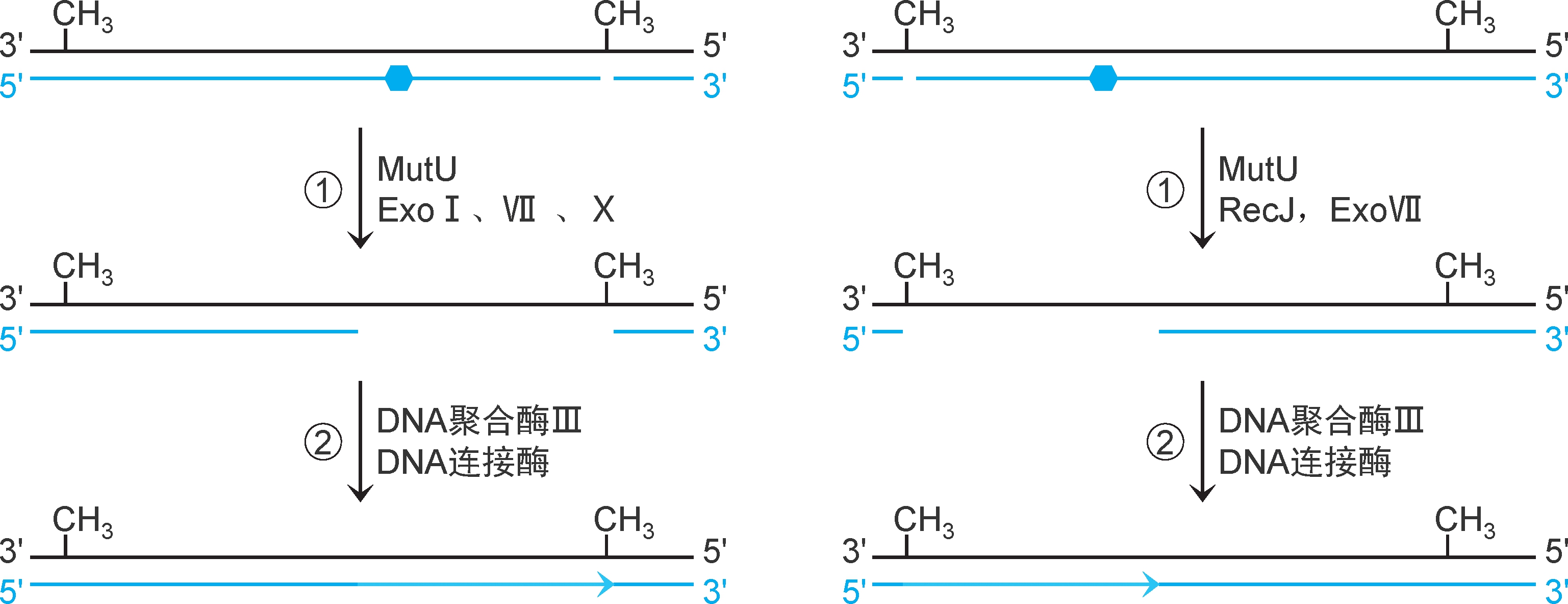 2.错配修复机制 ①解旋酶Ⅱ(又称UvrD解旋酶、解旋酶MutU,有ATPase活性和解旋酶活性,参与错配修复和核苷酸切除修复)从切口处向错配方向解旋DNA,SSB稳定,相应的核酸外切酶RecJ、ExoⅦ(5'→3'方向)或ExoⅠ、Ⅶ、Ⅹ(3'→5'方向)降解错配新生链,形成缺口。②DNA聚合酶Ⅲ催化合成DNA填补缺口,DNA连接酶催化封闭切口(图2-33)。