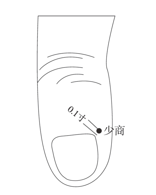 【定位】 在手指,拇指末节桡侧,指甲根角侧上方0.1寸(指寸)(图4-4)。
