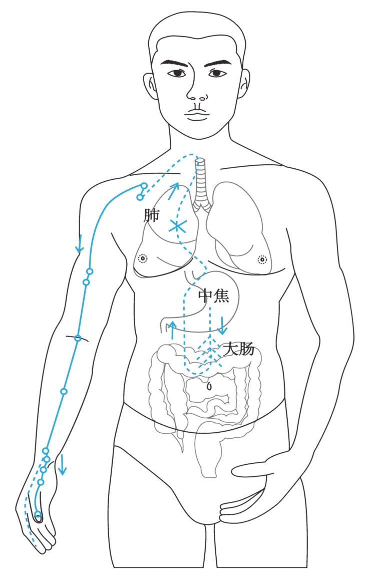 手太阴肺经,起于中焦,向下联络大肠,再返回沿胃上口,穿过横膈,入属于肺:从肺系(气管喉咙部)向外横行至腋窝下,沿上臂内侧下行,循行于手少阴与手厥阴经之前,下至肘中,沿着前臂内侧桡骨尺侧缘下行,经寸口动脉搏动处,行至大鱼际,再沿大鱼际桡侧缘循行直达拇指末端。其支脉,从手腕后分出,沿着食指桡侧直达食指末端(图4-1)。