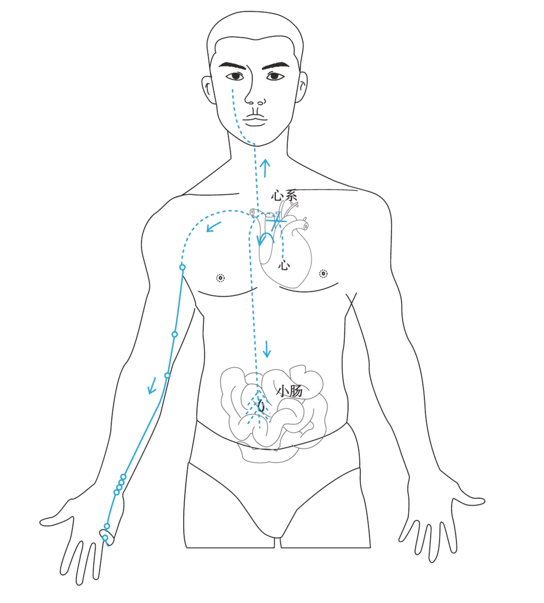手少阴心经,起于心中,出属心系(心与其他脏器相连的组织);下行经过横膈,联络小肠。其支脉,从心系向上,夹着食道上行,连于目系(眼球连接于脑的组织)。其直行经脉,从心系上行到肺部,再向外下到达腋窝部,沿着上臂内侧后缘,行于手太阴经和手厥阴经的后面,到达肘窝;再沿前臂内侧后缘,至掌后豌豆骨部,进入掌内,止于小指桡侧末端(图4-27)。