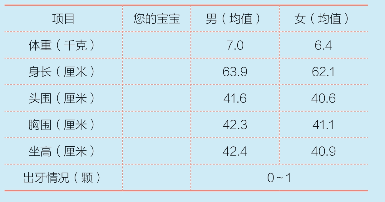这时宝宝的体重可达到出生时的两倍,胸围和头围大致一样,身长也比出生时长了10厘米以上。以后,体重和身长的增长速度开始减慢,但每个宝宝都不一样,没必要跟别的宝宝做比较。只要宝宝有活力,就说明很健康,不用过于担心。
