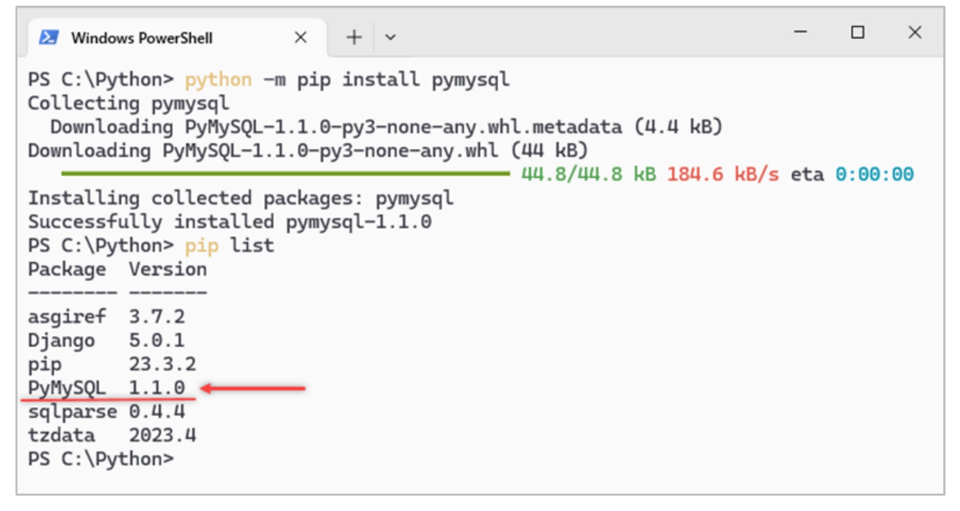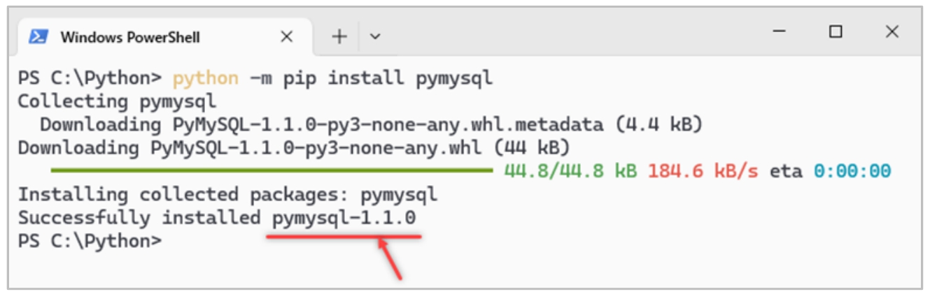 安装过程中如果出现问题,就耐心多试几次。安装完成后,命令行会给出“安装成功”的提示信息,如图3.1所示。这里安装的pymysql版本是1.1.0,该版本是当前的最新版。