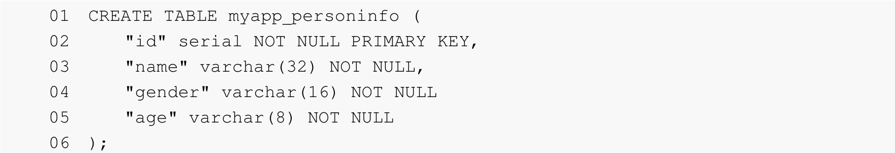 在第01行代码中定义的表名称myapp_ personinfo是自动从某些模型元数据中派生出来,用户也可以自定义表名称。