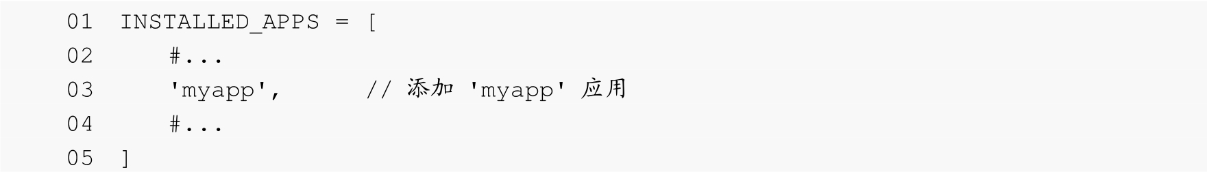 在第03行代码中,myapp应用就是通过调用django-admin manage.py startapp myapp命令创建的。