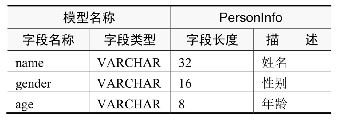 如果需要设计实现一个简单的个人信息模型(名称为PersonInfo),我们一般会定义这个个人信息模型的模型名称、字段名称、字段类型等参数,如表3.1所示。
