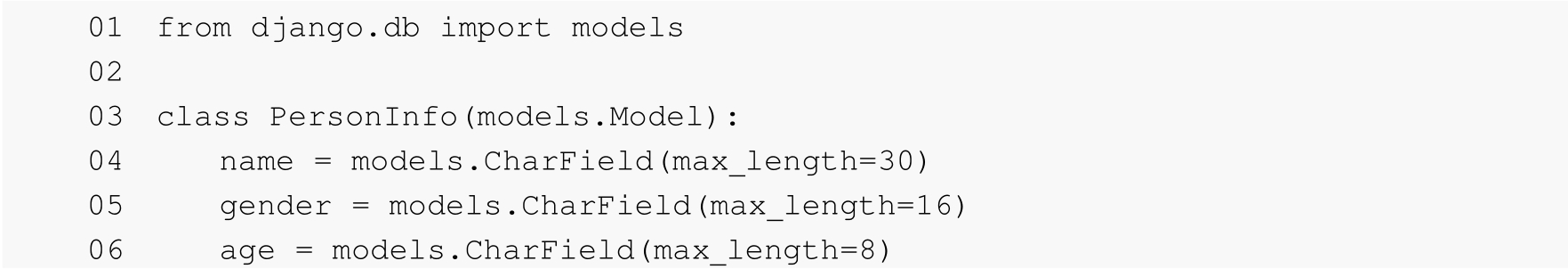 第03~06行代码定义了一个PersonInfo类,并通过models对象调用CharField()方法定义了name(姓名)、gender(性别)和age(年龄)3个字段,且每个字段的长度不一。这3个字段(name、gender和age)都相当于类(PersonInfo)的属性。这个类属性其实就相当于实体数据库中的数据项(也称数据列)。