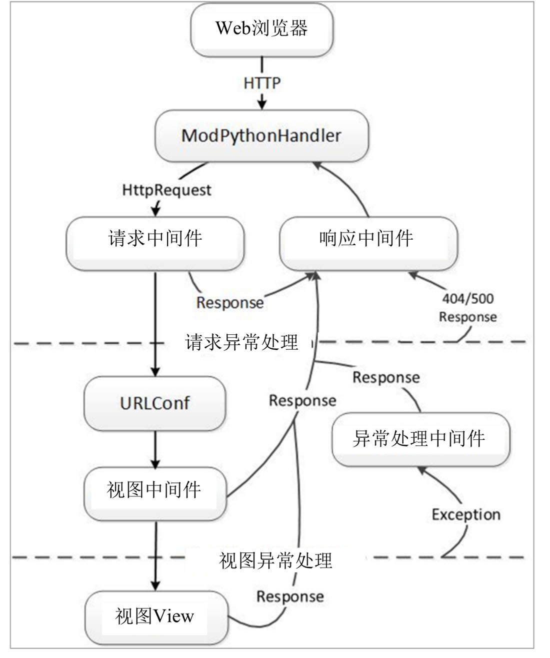 另外,Django框架还实现了完整的异常处理机制,主要是通过异常处理中间件(Exception Midware)来实现的。当系统出现异常时,异常处理中间件(Exception Midware)会截获并判断异常类型,并返回异常错误(404或500等)信息。