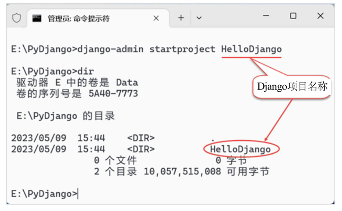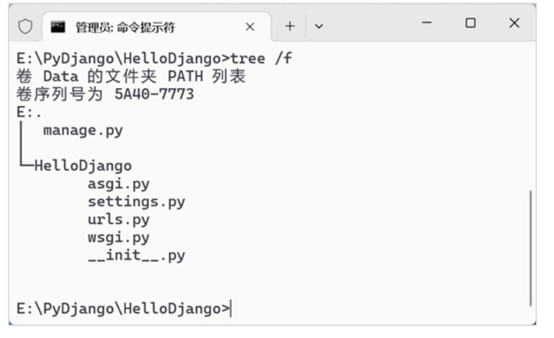 步骤01 通过django-admin管理工具在命令行创建Django应用程序,命令如下: