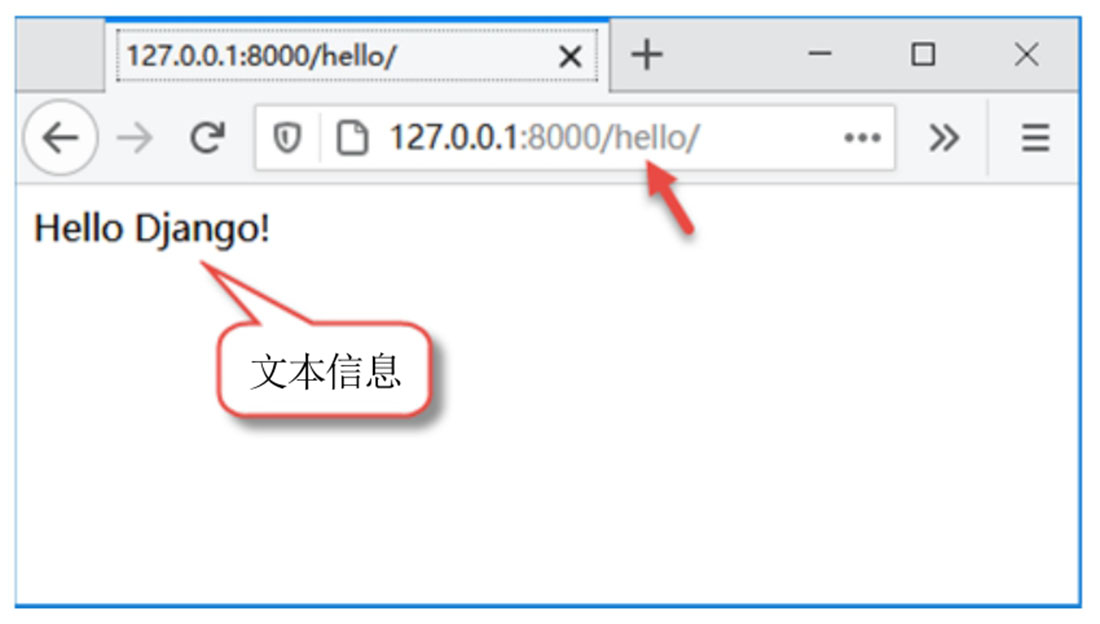 然后,打开浏览器(FireFox)并输入地址http://127.0.0.1:8000/hello,页面效果如图1.36所示。