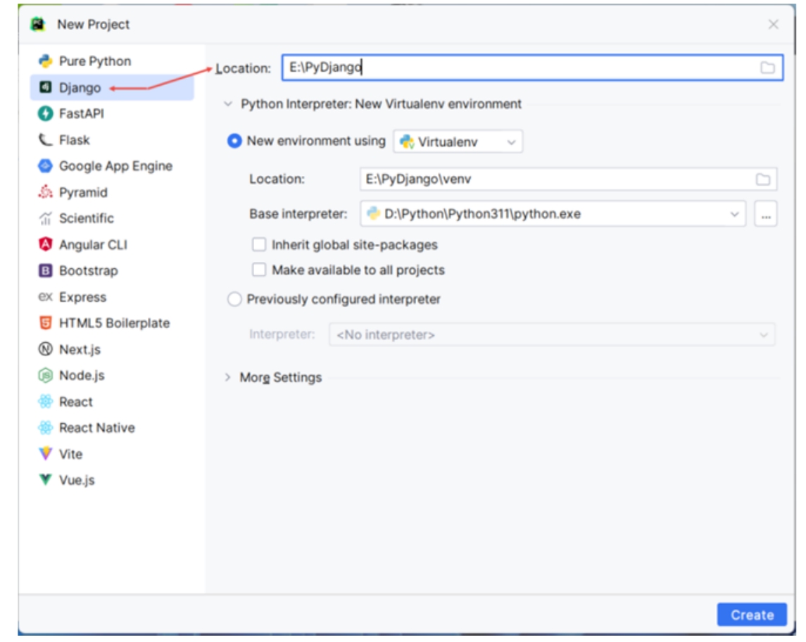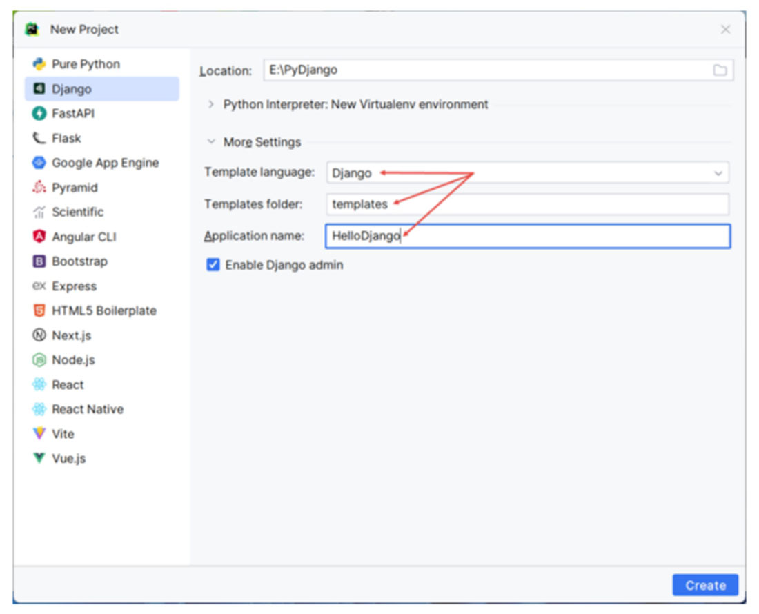 步骤02 在New Project界面左侧选择Django,在Location中设置好Django项目路径,如图1.31所示;打开More Settings,设置Template language为Django,Template folder为templates,Application name为HelloDjango,如图1.32所示。