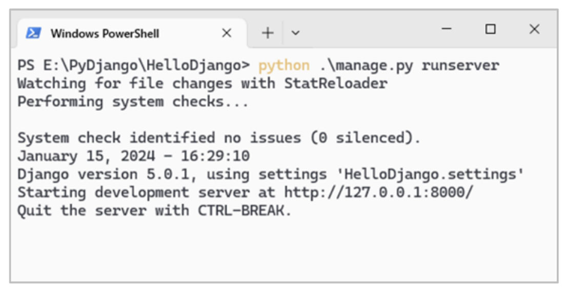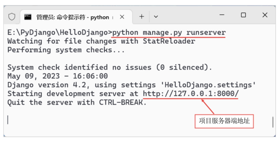 步骤03 通过命令行窗口进入HelloDjango项目的根目录,输入以下命令来启动Web开发服务器: