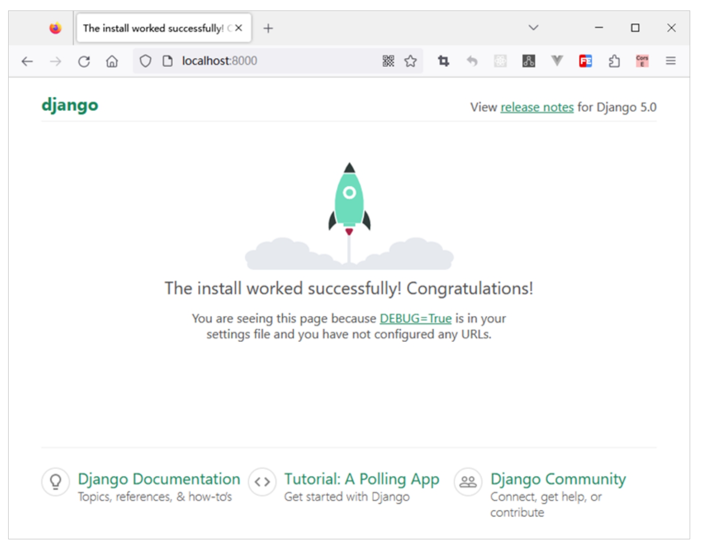步骤04 打开浏览器(FireFox)并输入日志信息中的服务器地址及端口号(http://127.0.0.1:8000)。如果浏览器页面效果如图1.29所示,就说明Django应用程序已经成功运行了。
