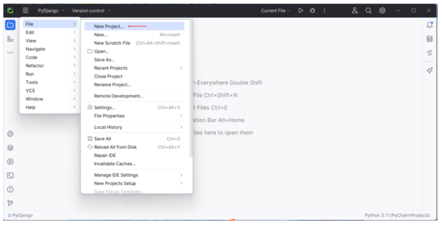 步骤01 打开PyCharm Pro专业版开发平台,通过文件菜单(File)的新建工程(New Project)选项创建Django项目,如图1.30所示。