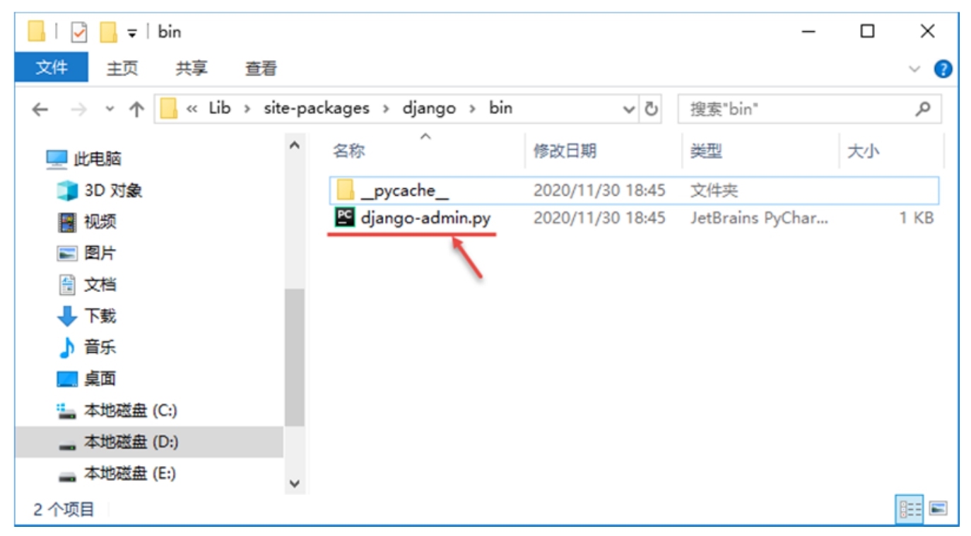 那么,这个django-admin.py管理工具在操作系统中的保存路径是什么呢?请读者再查看一下图1.20,它就在django目录下的bin目录中,具体如图1.25所示。