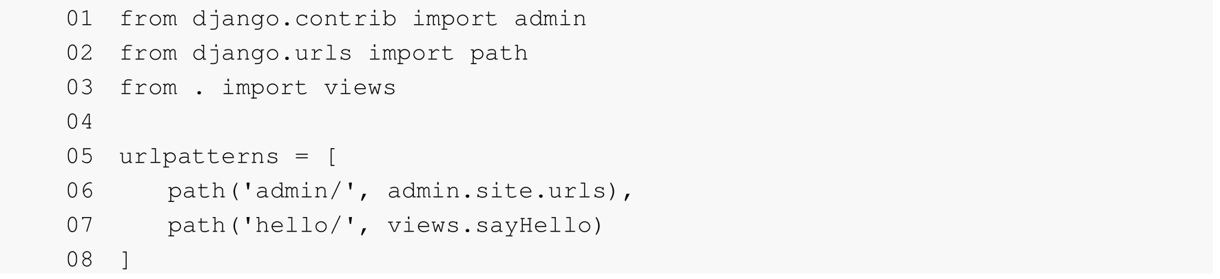 · 第07行代码通过调用路由方法(path())将视图页面(views.py)匹配到路由路径(/hello/)。