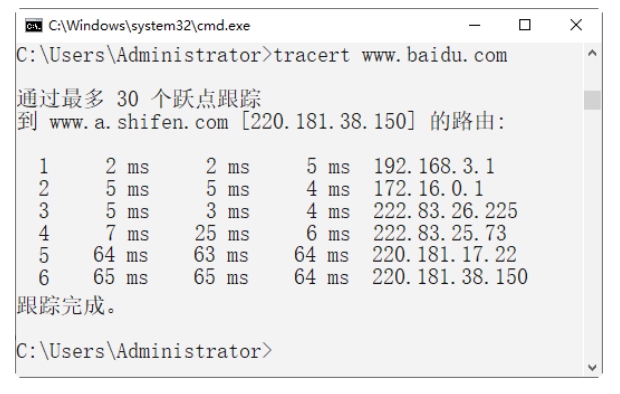 例如:如果想查看www.baidu.com的路由与局域网络连接情况,则在“命令提示符”窗口中输入tracert www.baidu.com命令,按Enter键,其显示结果如图3-26所示。