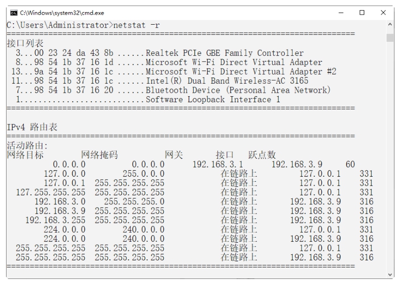 Step 02 在“命令提示符”窗口中输入netstat-r命令,按Enter键,即可查看本机的路由信息,如图3-23所示。