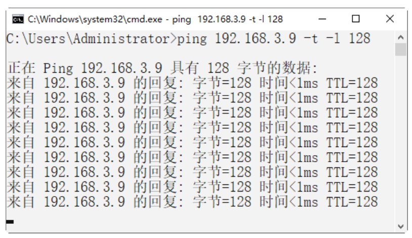 Step 02 在“命令提示符”窗口中输入ping 192.168.3.9 –t –l 128命令,可以不断向某台主机发出大量的数据包,如图3-16所示。