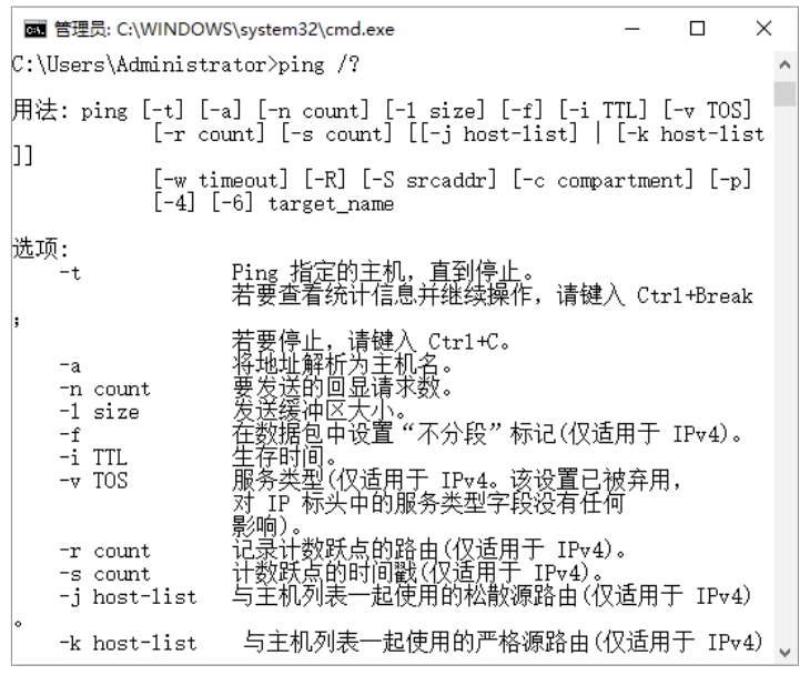 ping命令是协议TCP/IP中最为常用的命令之一,主要用来检查网络是否通畅或者网络连接的速度。对于一名计算机用户来说,ping命令是第一个必须掌握的DOS命令。在“命令提示符”窗口中输入ping/?,可以得到这条命令的帮助信息,如图3-14所示。
