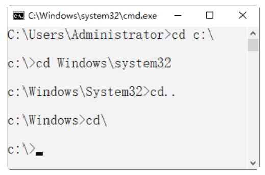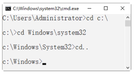 (2)cd..:cd后面的两个“.”表示返回上一级目录,例如当前的目录为C:\Windows,如果输入cd..命令,按Enter键即可返回上一级目录,即C:\。