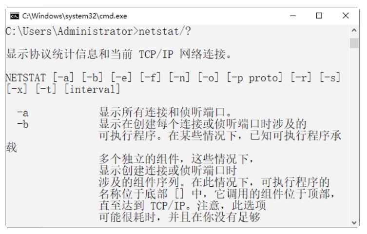 在“命令提示符”窗口中输入netstat/?,可以得到这条命令的帮助信息,如图3-21所示。