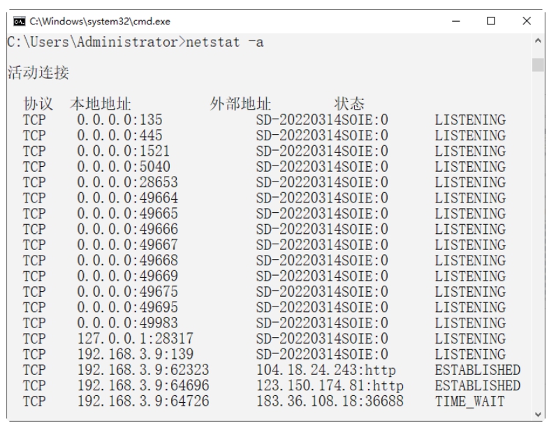 Step 03 在“命令提示符”窗口中输入netstat-a命令,按Enter键,即可查看本机所有活动的TCP连接,如图3-24所示。