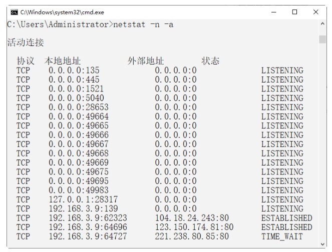 Step 04 在“命令提示符”窗口中输入netstat-n -a命令,按Enter键,即可显示本机所有连接的端口及其状态,如图3-25所示。