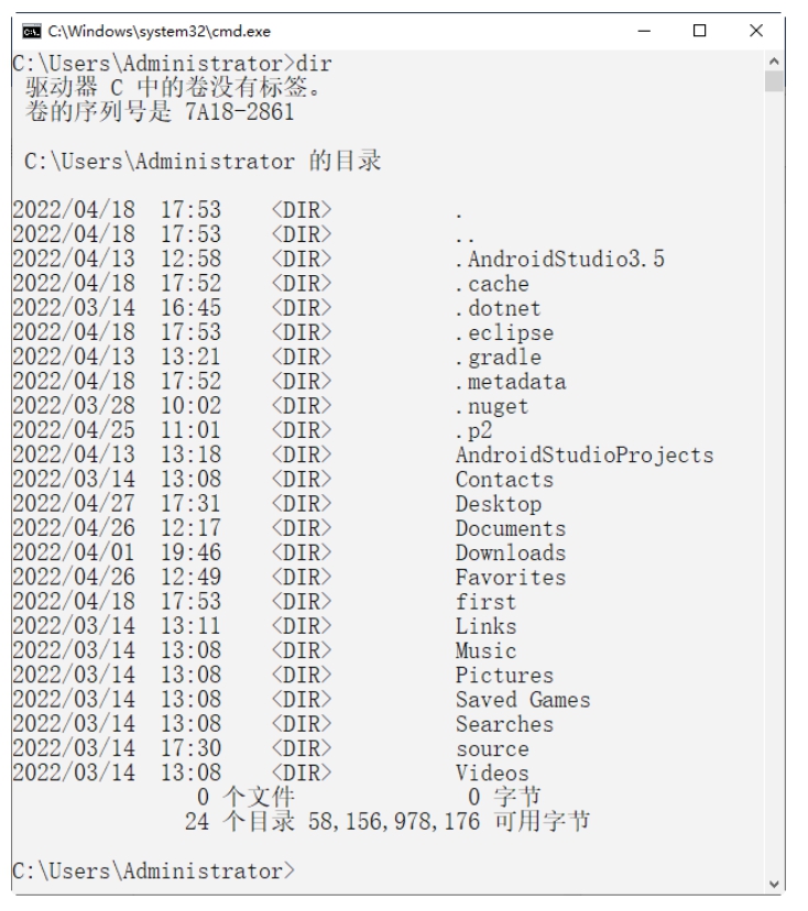 dir命令的作用是列出磁盘上所有的或指定的文件目录,可以显示的内容包含卷标、文件名、文件大小、文件建立日期和时间、目录名、磁盘剩余空间等。dir命令的格式如下。