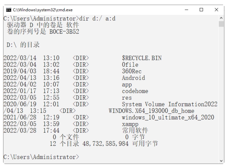 Step 02 在“命令提示符”窗口中输入dir d:/a:d命令,按Enter键,即可查看D盘下的所有文件的目录,如图3-12所示。