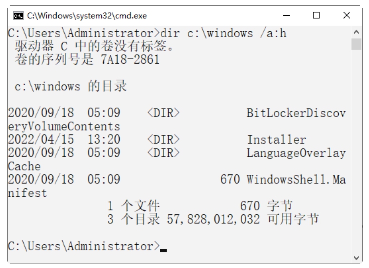 Step 03 在“命令提示符”窗口中输入dir c:\windows /a:h命令,按Enter键,即可列出C:\windows目录下的隐藏文件,如图3-13所示。
