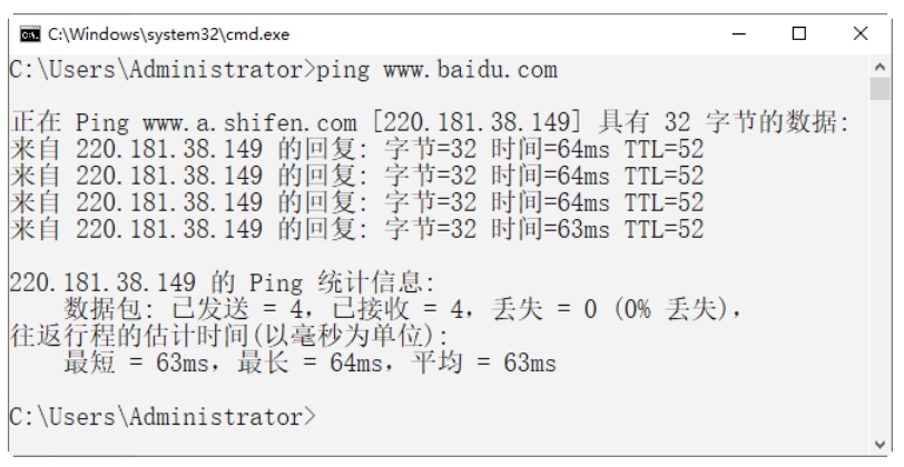 Step 03 判断本台计算机是否与外界网络连通。在“命令提示符”窗口中输入ping www.baidu.com命令,其运行结果如图3-17所示,说明本台计算机与外界网络连通。