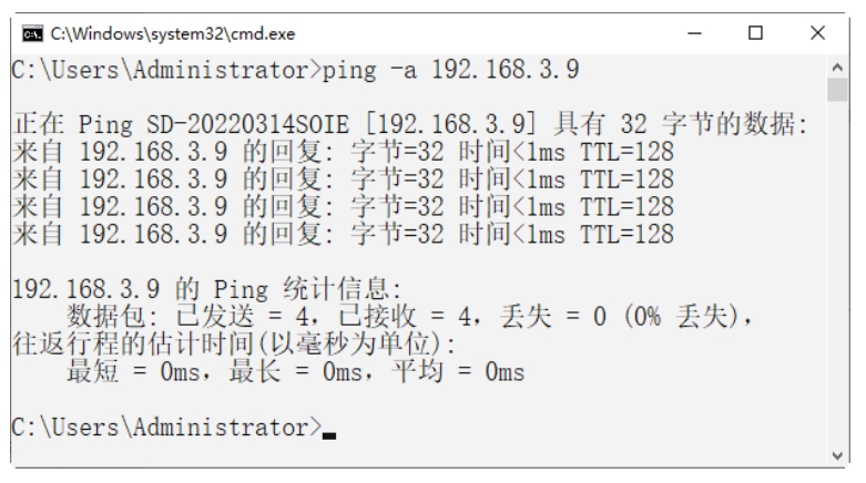 Step 04 解析某IP地址的计算机名。在“命令提示符”窗口中输入ping -a 192.168.3.9命令,其运行结果如图3-18所示,可知这台主机的名称为SD-20220314SOIE。
