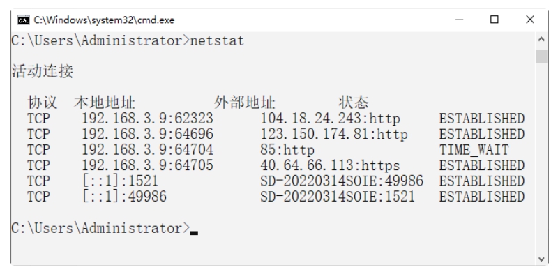 Step 01 打开“命令提示符”窗口,在其中输入netstat -n或netstat命令,按Enter键,即可查看服务器活动的TCP/IP连接,如图3-22所示。