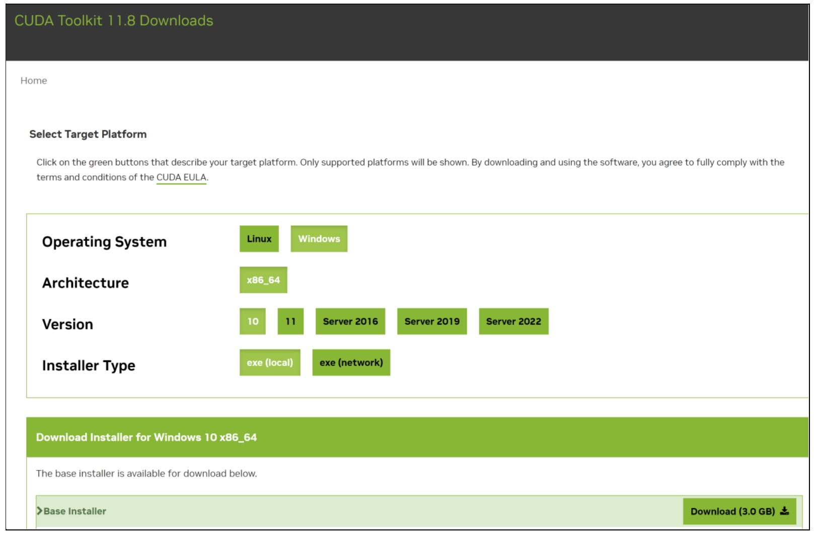 根据实际情况选择合适的版本,比如计算机操作系统是Windows 10,这里下载CUDA 11.8.0的本地安装包,如图2-12所示。
