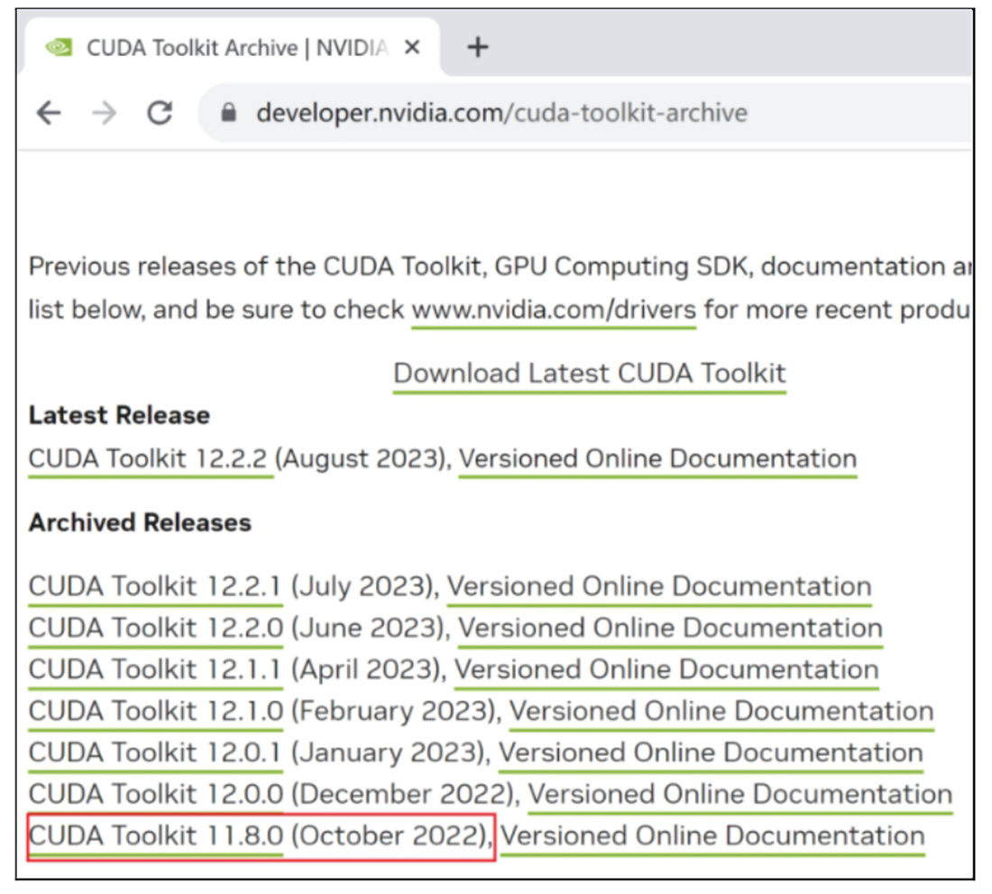 我们已经知道,CUDA是显卡厂商NVIDIA推出的通用并行计算架构,能利用英伟达GPU的并行计算引擎。目前已经确认系统已有支持CUDA的显卡,这时可以到NVIDIA网站(https://developer.nvidia.com/cuda-toolkit-archive)下载CUDA,如图2-11所示。注意,安装CUDA Driver时,需要与Nvidia GPU Driver的版本驱动一致,CUDA才能找到显卡。