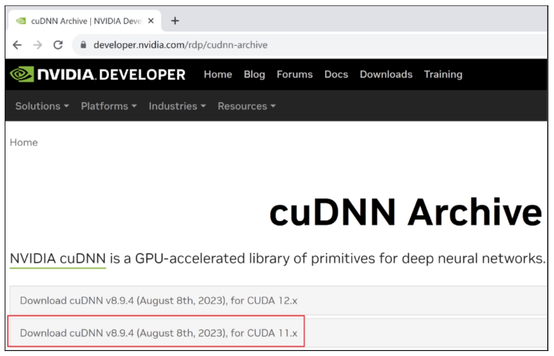 进入下载页面后,注意不要选择错误的版本,一定要找到对应CUDA的版本号。另外,如果使用的是Windows 64位的操作系统,那么需要对应下载x86版本的cuDNN。