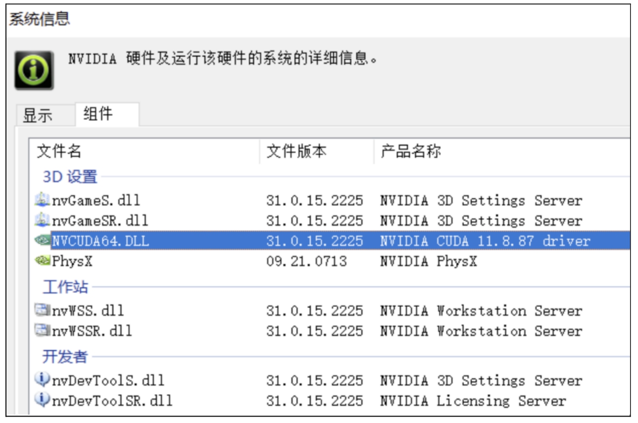 打开NVIDIA控制面板窗口,可以查看NVIDIA的一些信息,包括显卡的驱动版本,通过单击“帮助”菜单,并选择“系统信息”选项,查看系统信息获取支持的CUDA版本。如图2-10所示,选择“组件”,在3D设置模块找到NVCUDA64.DLL,在该行可以看到该NVCUDA的版本,可以看到图中显示的版本是11.8。
