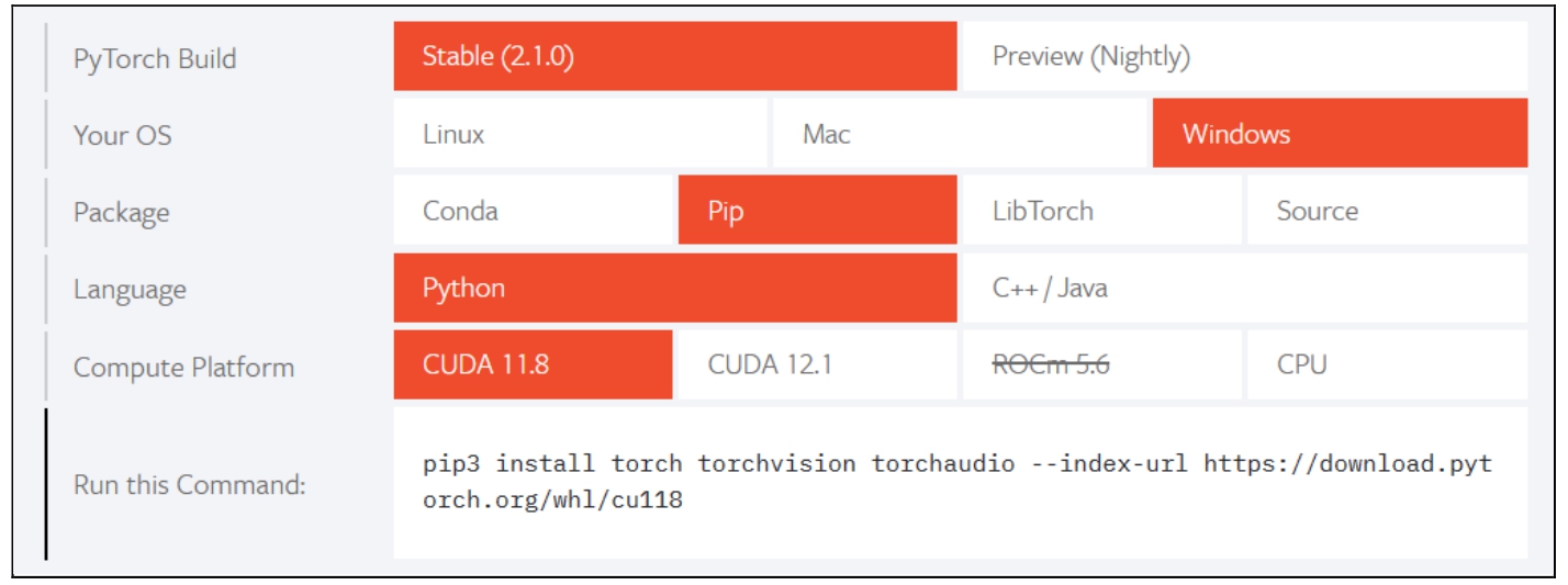 安装GPU版本的PyTorch稍微复杂,前提是需要安装CUDA、cuDNN并行计算框架,然后安装PyTorch。PyTorch官网(地址为https://pytorch.org)给出了匹配的版本号及安装命令,如图2-17所示。
