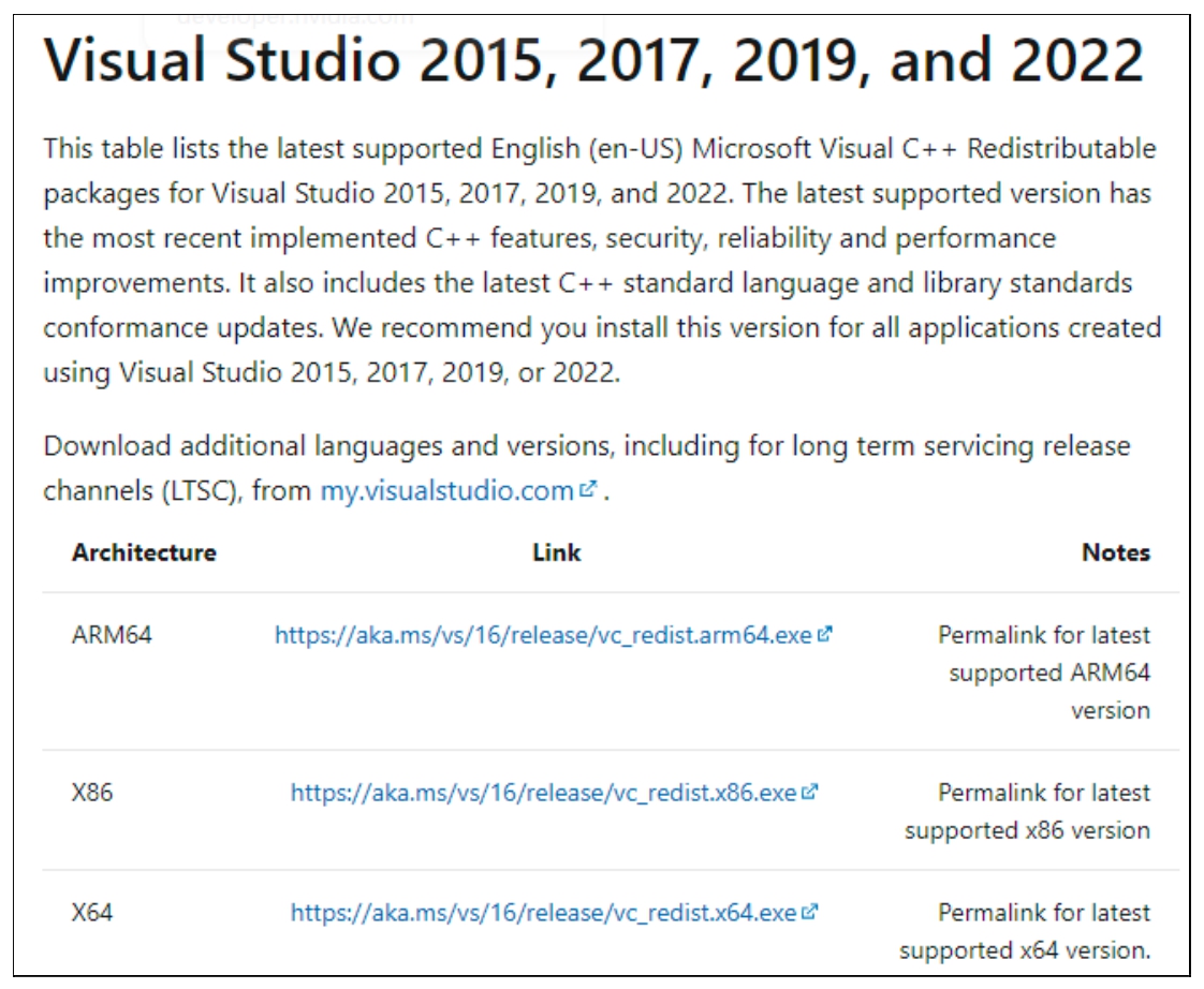 接下来安装Visual Studio 2015、2017、2019和2022支持库,这个支持库务必安装,否则后面安装PyTorch支持库会出现各种“坑”。支持库不大,有十多兆字节,安装完成后重启系统。其下载地址为https://docs.microsoft.com/zh-CN/cpp/windows/latest-supported-vc-redist?view=msvc-160,下载页面如图2-16所示。
