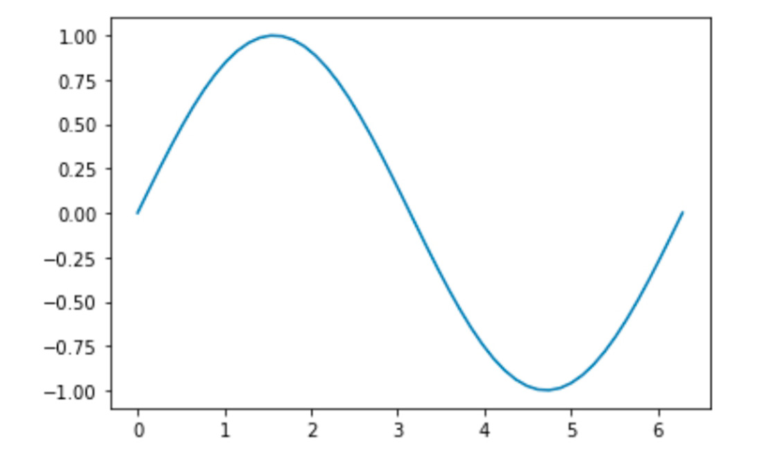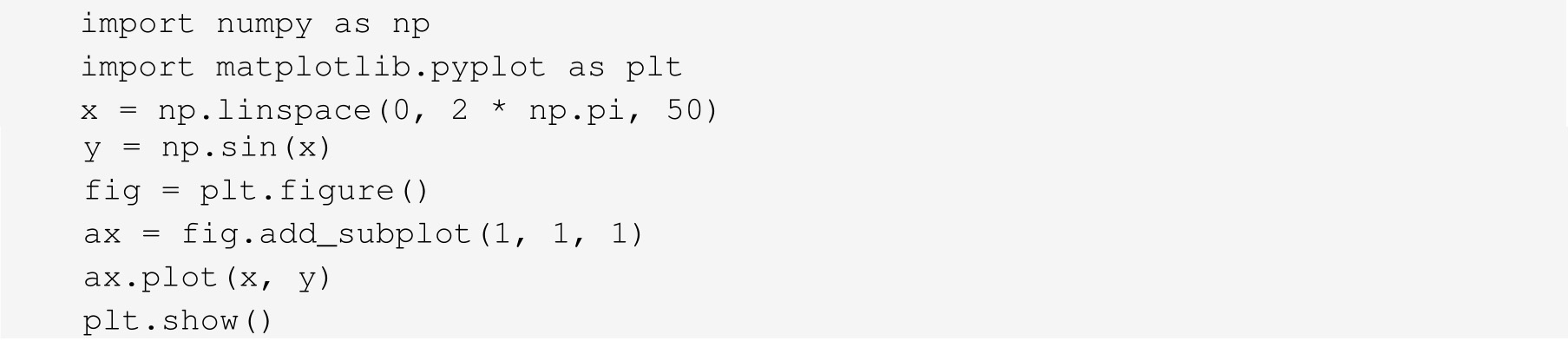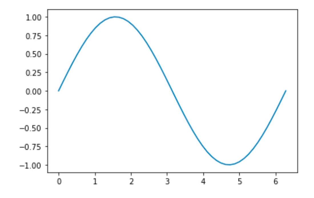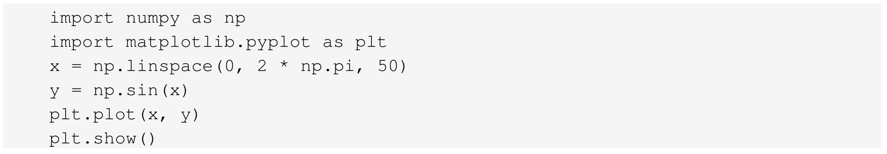 从最简单开始绘制一条正弦曲线,代码如下。在代码的最开始,首先引入相关模块并重命名为np和plt,其中np用来生成图形数据,plt就是绘图模块。然后使用np.linspace生成包含50个元素的数组作为x轴数据,这些元素均匀地分布在[0, 2π]区间上,再使用np.sin生成x对应的y轴数据。接着使用plt.plot(x, y)画一个折线图形,并把x和y绘制到图形上。最后调用plt.show()把绘制好的图形显示出来。注意,使用plot()方法时传入了两组数据:x和y,分别对应x轴和y轴。如果仅传入一组数据,那么该数据就是y轴数据,x轴将会使用数组索引作为数据。从绘制的图表中,可以看到它包含x、y轴刻度和曲线本身。