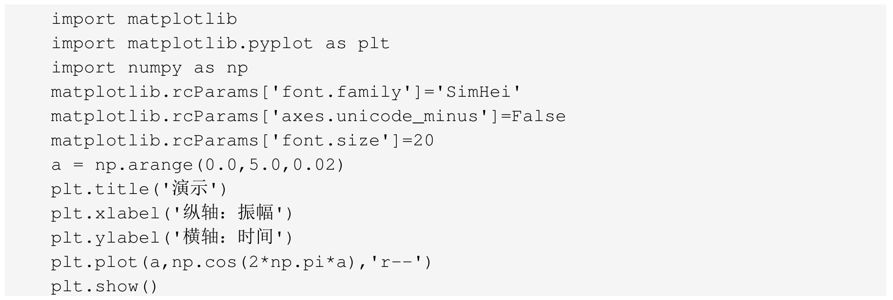 使用plt.title()函数为图表添加标题,使用plt.xlable()和plt.ylabel()函数分别为x轴和y轴添加标签,代码如下。pyplot并不默认支持中文显示,需要rcParams修改字体实现,但由于更改字体会导致显示不出负号“-”,需要将配置文件中的axes.unicode_minus参数设置为False。