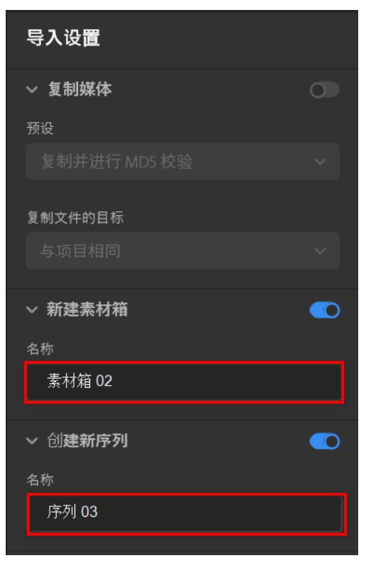 打开【创建新序列】选项,输入序列名称后可以直接将媒体文件以序列的方式导入。
