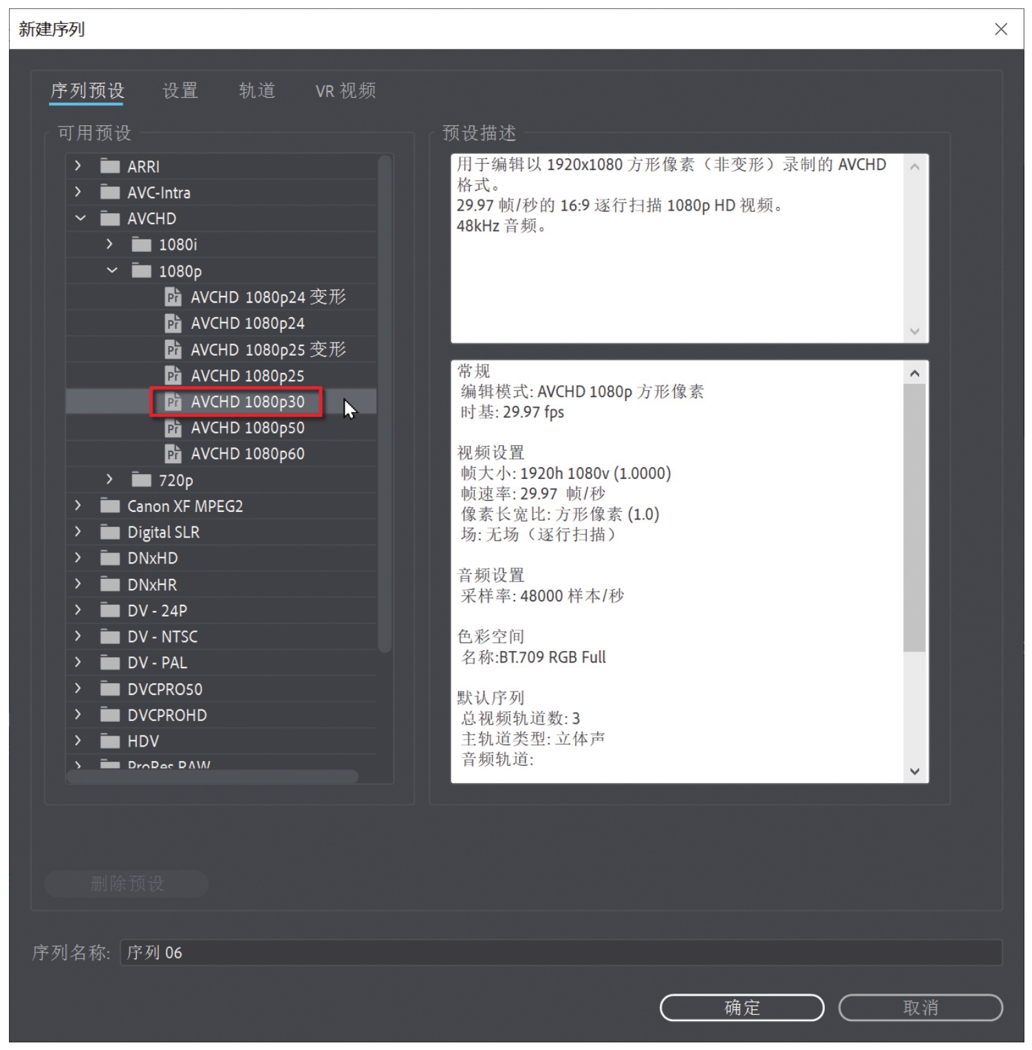 【序列预设】选项卡让新建序列变得更加简单。如选择【AVCHD】-【1080p】-【AVCHD 1080p30】,会在右侧看到相应的预设描述等信息,如图A03-22所示。