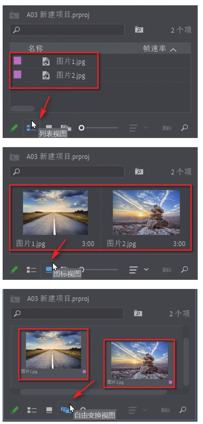 【项目】面板中的素材可以根据用户的喜好设置为【列表视图】【图标视图】【自由变换视图】三种视图方式,移动旁边的滑块还可以调整图标和缩览图的大小,如图A03-7所示。