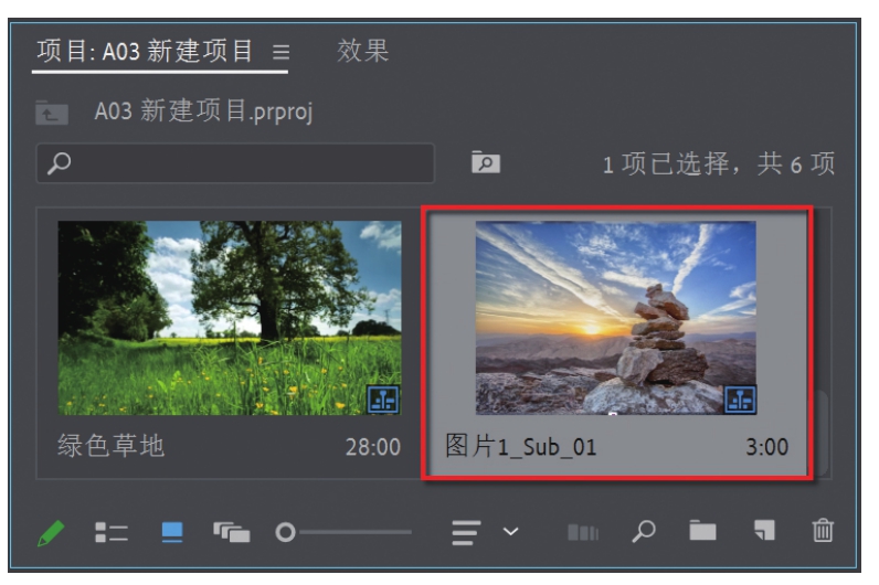 选择部分剪辑,右击,选择【制作子序列】选项,在当前序列上并没有什么改变,在【项目】面板中会出现“图片1_Sub_01”子序列,如图A03-29所示。双击打开子序列,该子序列中只会出现当时选中的剪辑。