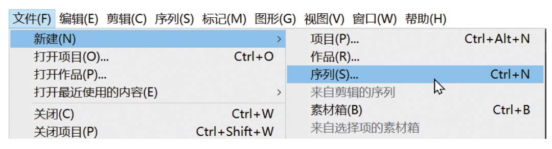 ◆ 执行【文件】-【新建】-【序列】命令,快捷键为Ctrl+N,如图A03-20所示。