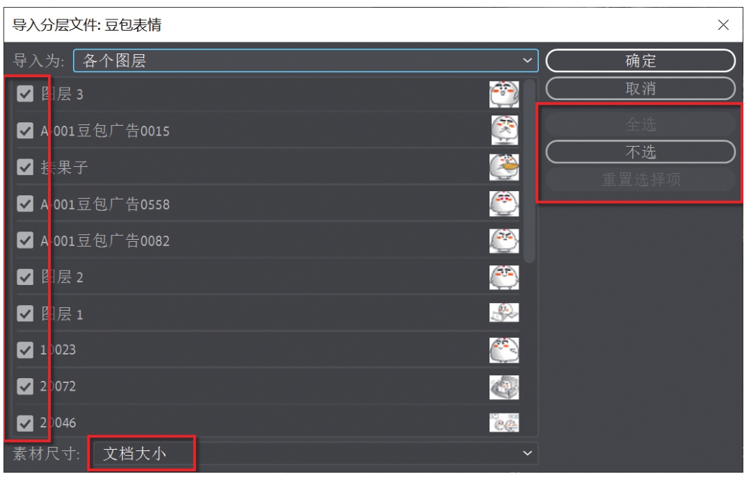 ● 【各个图层】: 将导入素材中选中的图层导入并生成素材箱,打开素材箱,其中的每个图层都是独立的,默认情况下选中全部图层。在对话框右侧部分可以选择【全选】或者【不选】选项,在对话框底部可以选择导入素材的【文档大小】或【图层大小】,如图A03-9所示。
