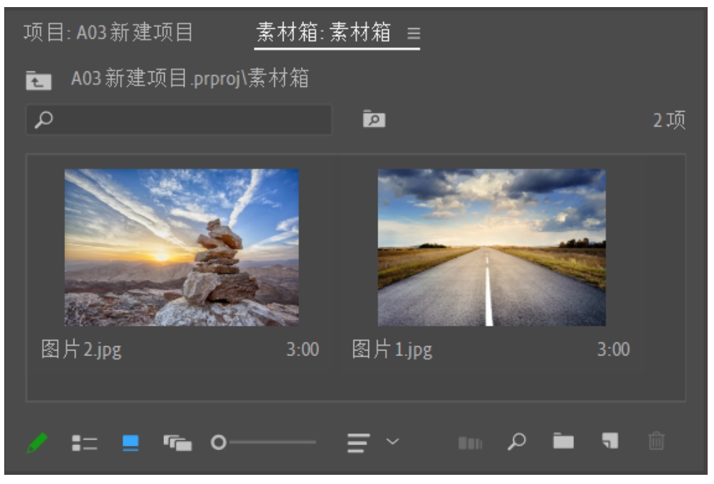 按钮,按照素材类型将素材箱重命名后,将素材拖曳到素材箱即可,方便后期使用。双击素材箱可以在【项目】面板所在的面板组中生成新的选项卡,素材箱中的素材将被单独显示出来,如图A03-10所示。
