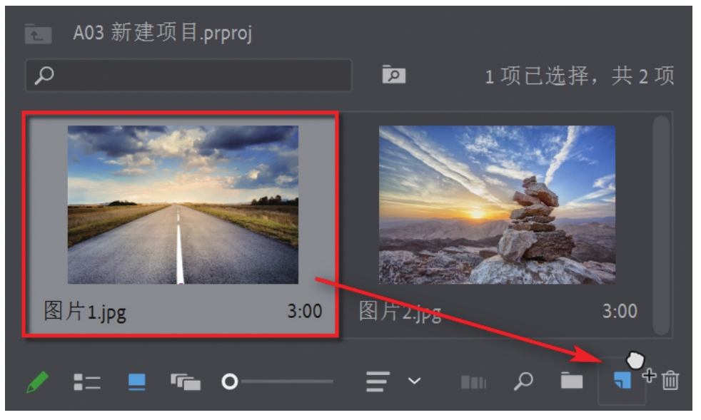 ◆ 选中剪辑,右击,选择【从剪辑新建序列】选项或者将剪辑拖曳到面板底部的【新建项】按钮上,即可创建自动匹配源素材的序列,如图A03-24所示。