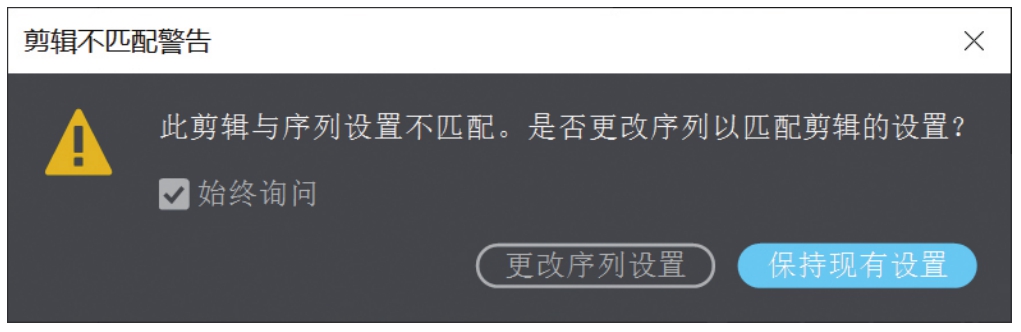 ◆ 有时新建序列后添加剪辑,会出现弹窗信息,可以单击【更改序列设置】按钮,软件会自动根据素材调整序列设置,也可以单击【保持现有设置】按钮,如图A03-26所示。